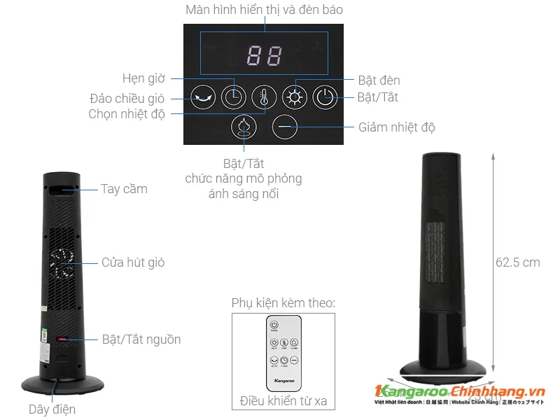Với thiết kế hình trụ 25×62.5x25cm và trọng lượng 2.2 kg, máy sưởi Kangaroo KGAH06G dễ dàng lắp đặt và di chuyển, tạo không gian ấm cúng trong phòng ngủ hoặc văn phòng.
